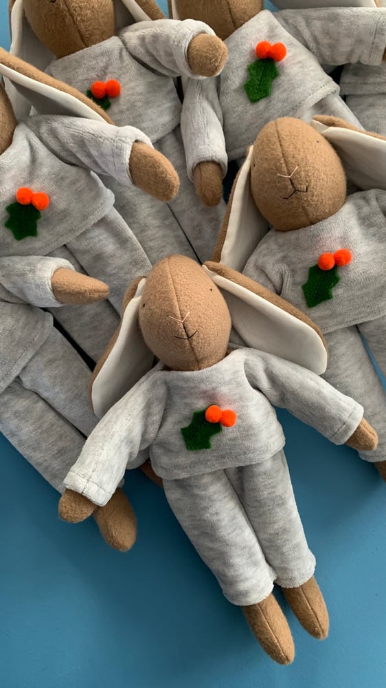 Habillé d'un pyjama en jersey de velours gris clair (pantalon et haut).